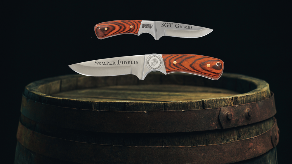 A gorgeous gifting set that includes a 7 3/4" fixed blade knife with a Pakkawood handle paired with a 420 steel blade, and water buffalo hide sheath all neatly boxed and customizable. Both sheath, and knife can be etched.