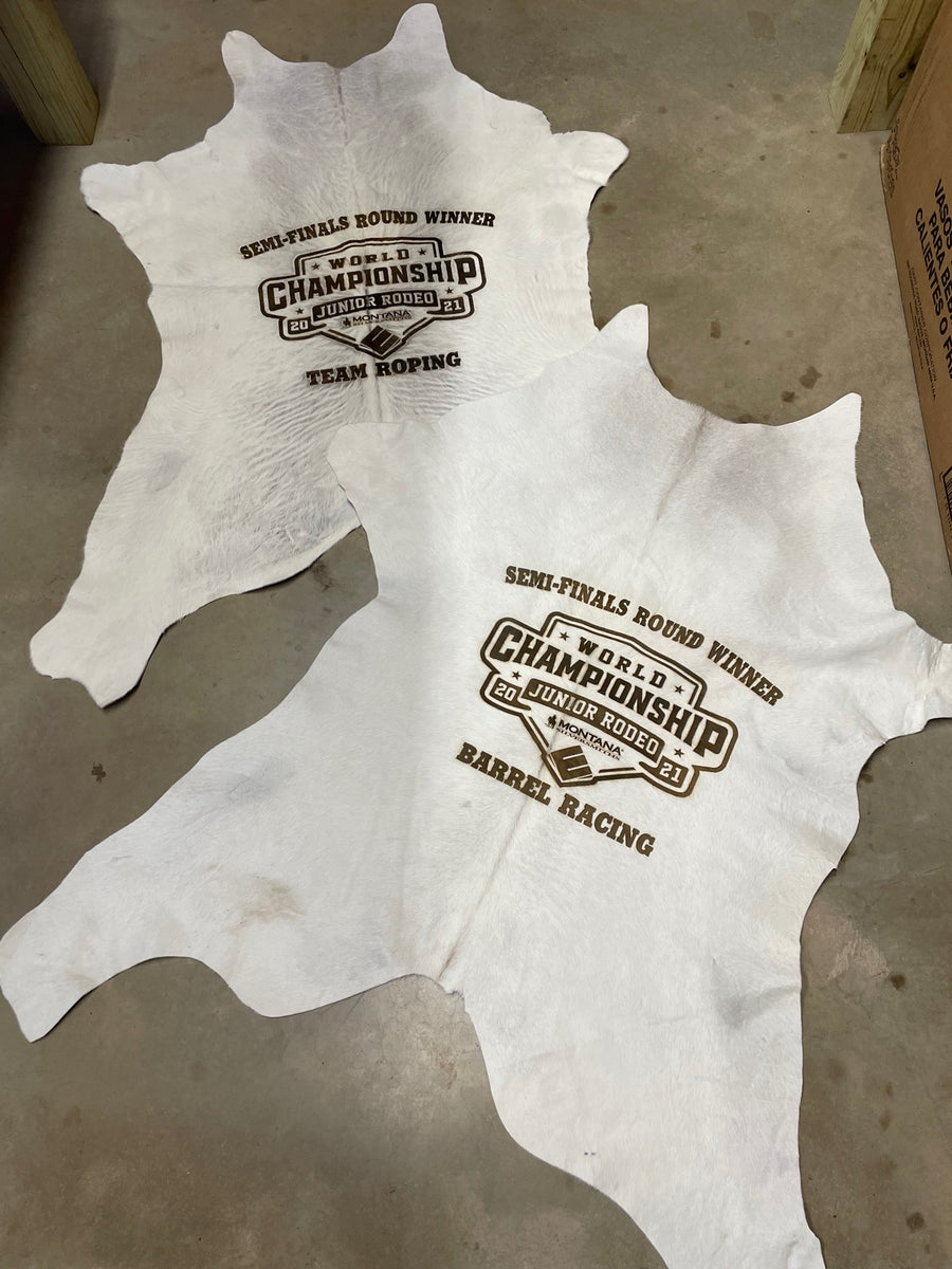 Our smaller calf hides averaging a size of 40"x30" make for great home decor and awards! Put them on your bed, over your couch, your floor, or your table, or hang them on your wall! Looking for a unique gift or award? They can be personalized with a custom design, name, logo, dates, and more!